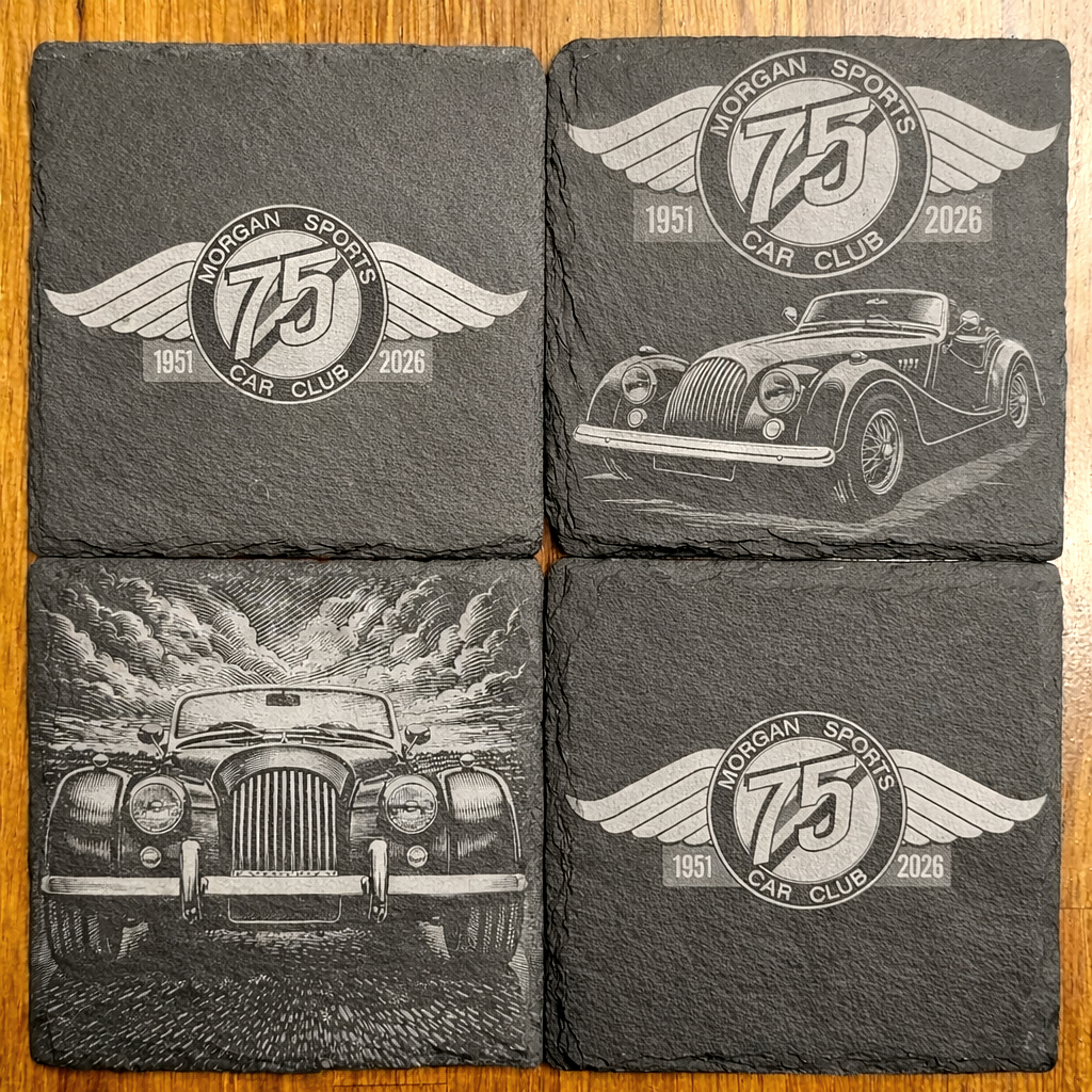 Commissioned to celebrate the Morgan Sports Car Club’s 75th anniversary, this bespoke slate coaster set combined heritage artwork with precision engraving. All profits were donated to the StarterMotor charity, helping introduce young people to classic motoring and engineering.